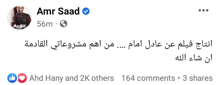 وكتب عمرو سعد عبر حسابه الرسمي بموقع التواصل الإجتماعي “فيسبوك”: إنتاج فيلم عن عادل إمام.. من أهم مشروعاتي القادمة إن شاء الله.