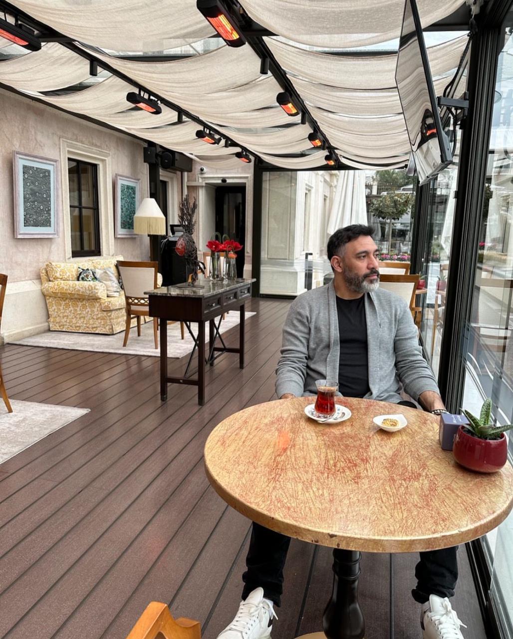 وظهر عمرو مصطفى وهو يتناول الشاي ووجبة الإفطار في إحدى المقاهي الهادئة في إسطنبول.