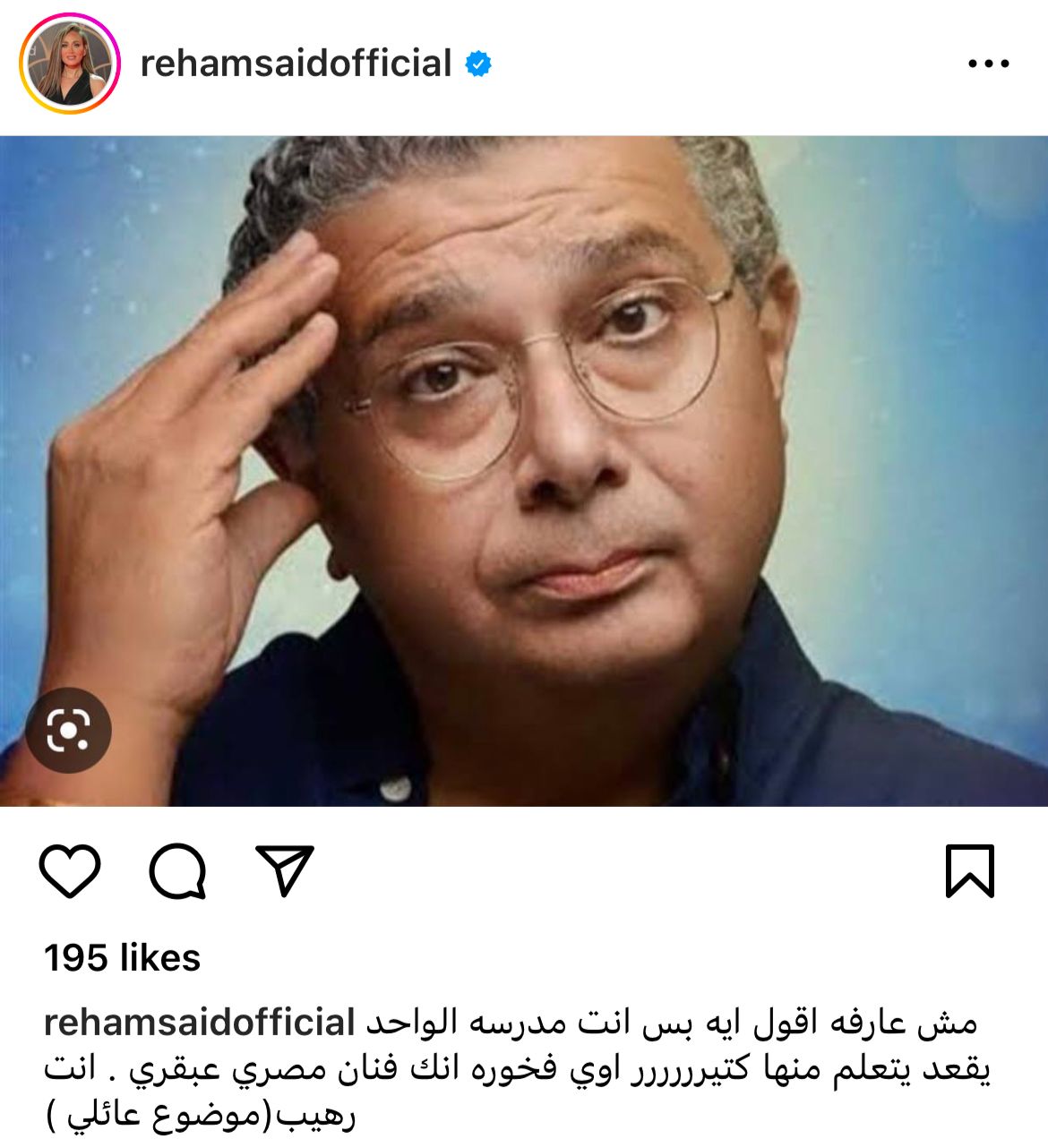 ونشرت ريهام صورة للفنان عبر انستجرام، وعلقت: مش عارفة أقول ايه بس أنت مدرسة الواحد يقعد يتعلم منها كتير أوي، فخورة إنك فنان مصري عبقري.. انت رهيب.