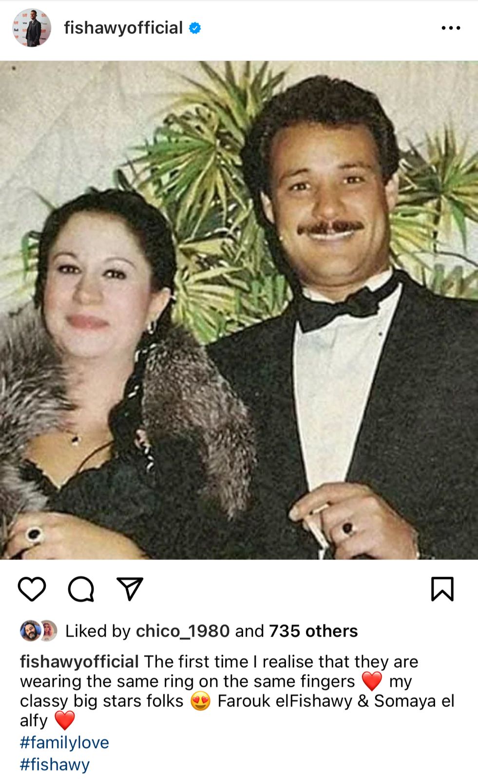 وعلق أحمد الفيشاوي على الصورة: أول مرة أخد بالي انهم لابسين الخاتم في نفس الصباع، النجوم الكبار الأنيقون فاروق الفيشاوي وسمية الألفي.
