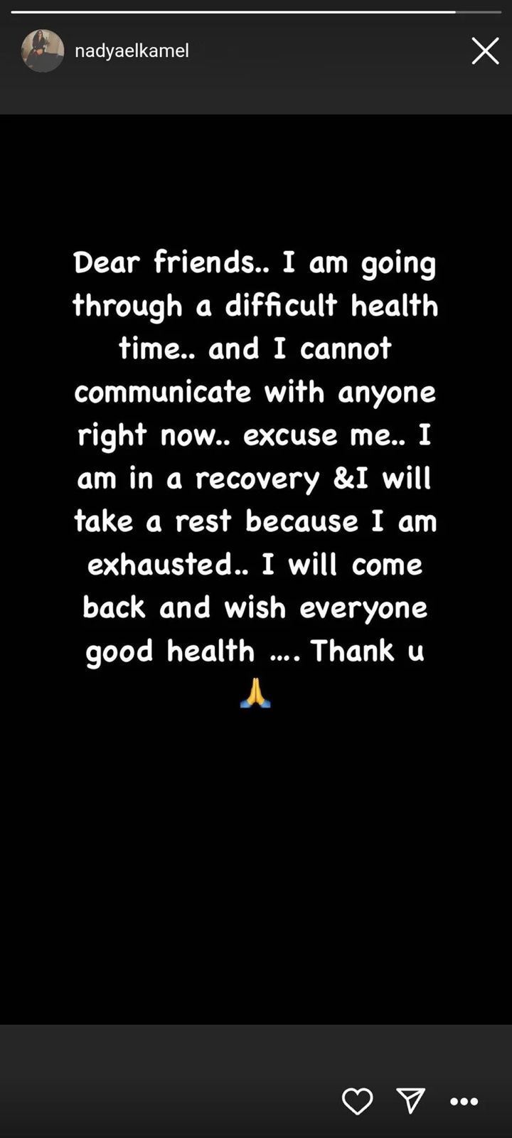 وكتبت ندى عبر خاصية ستوري: أصدقائى.. أنا أمر بحالة صحية صعبة حاليًا ولا أستطيع أن أتواصل مع أى شخص فى الوقت الحالي.