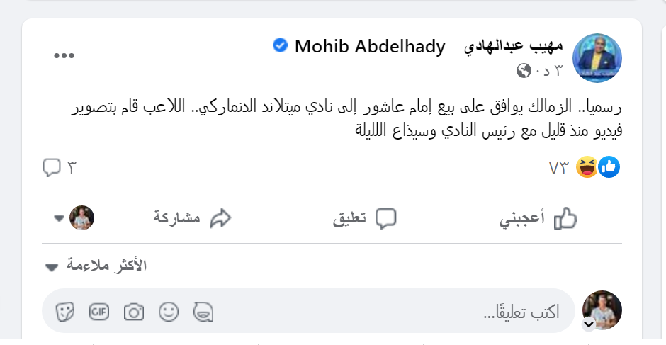 وكتب مهيب عبد الهادي عبر حسابه الرسمي على «فيس بوك»: «رسميا، الزمالك يوافق على بيع إمام عاشور إلى نادي ميتلاند الدنماركي.. اللاعب قام بتصوير فيديو منذ قليل مع رئيس النادي وسيذاع الليلة».