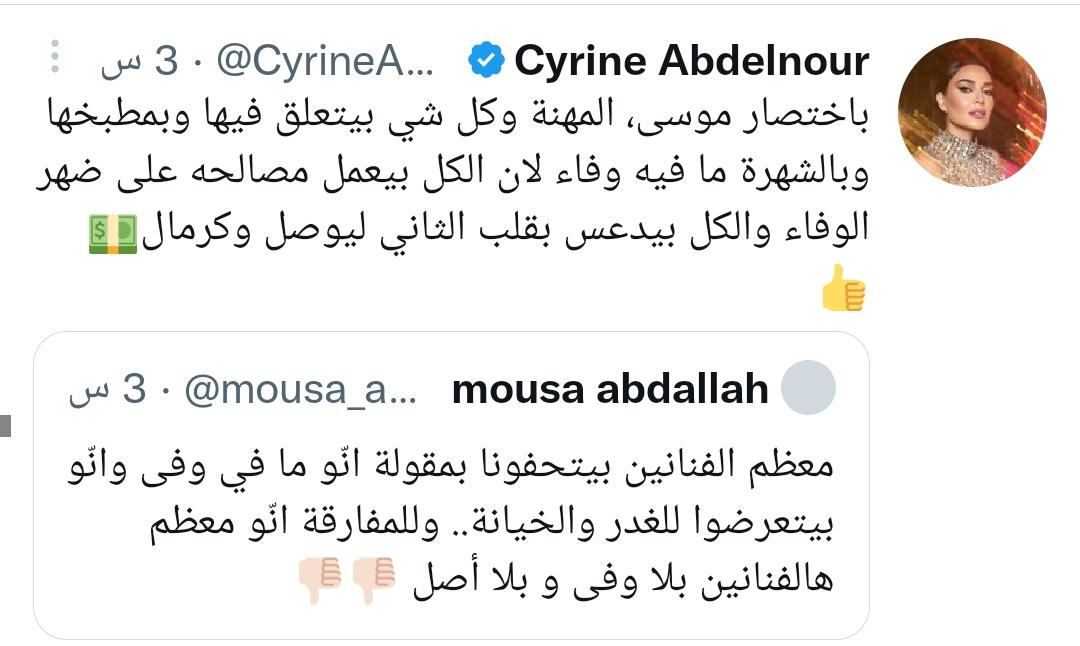 حيث كتبت سيرين: "المهنة وكل شي بيتعلق فيها وبمطبخها وبالشهرة ما فيه وفاء لأن الكل بيعمل مصالحه على ضهر الوفاء والكل بيدعس بقلب الثاني ليوصل وكرمال المال".