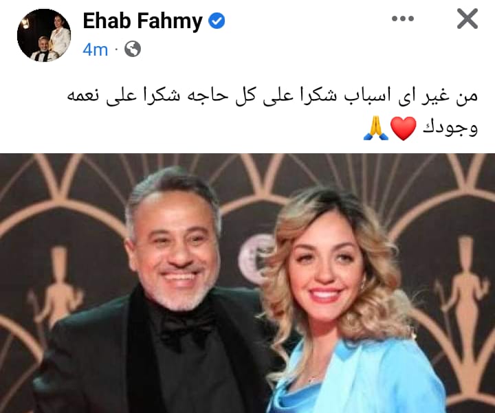حرص الفنان إيهاب فهمي على توجيه رسالة رومانسية لـ زوجته وذلك عبر حسابه الرسمي بموقع التواصل الإجتماعي “فيسبوك”.