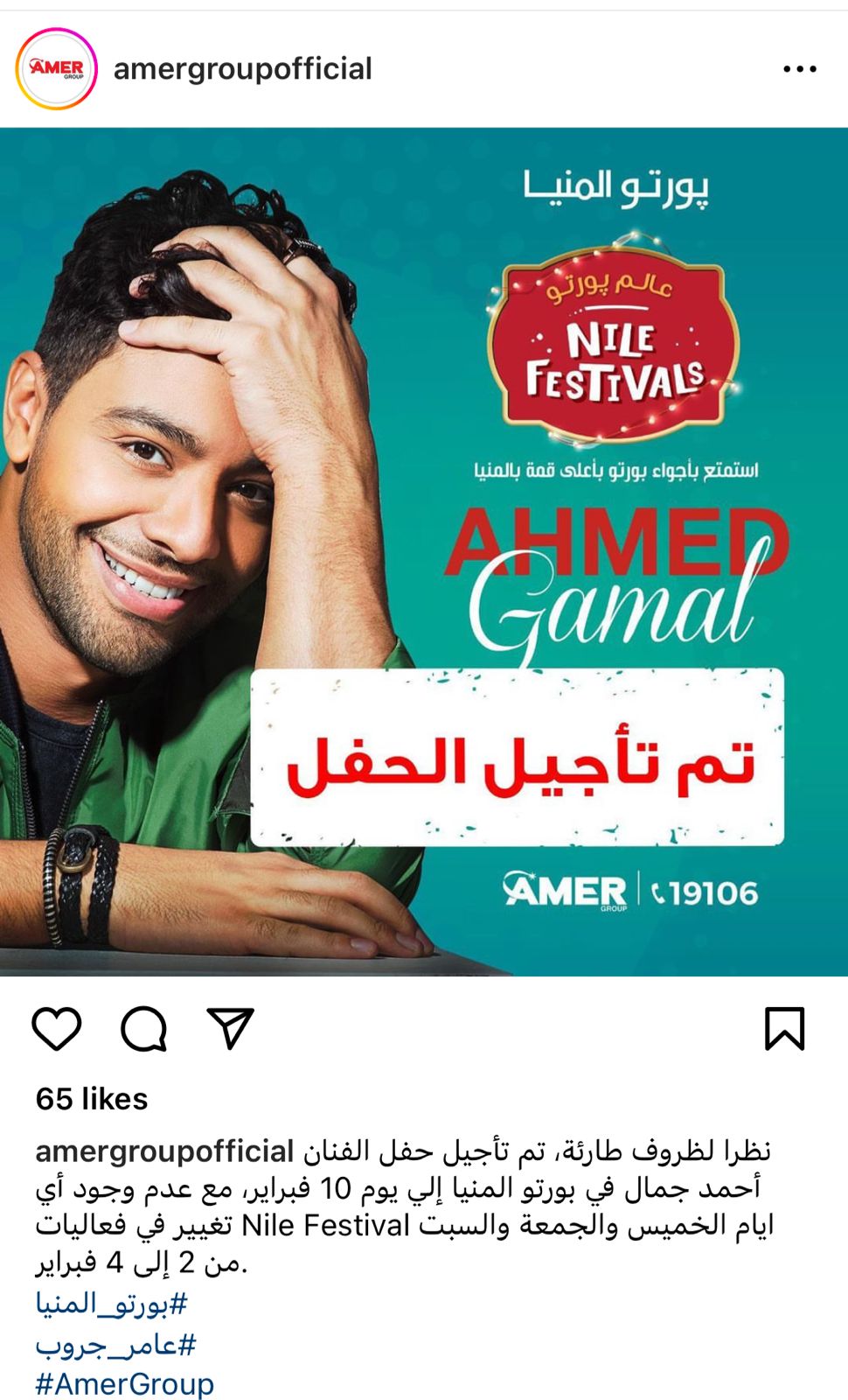 وجاءت تفاصيل المنشور: نظرًا لظروف طارئة، تم تأجيل حفل الفنان أحمد جمال في بورتو المنيا إلى يوم 10 فبراير.