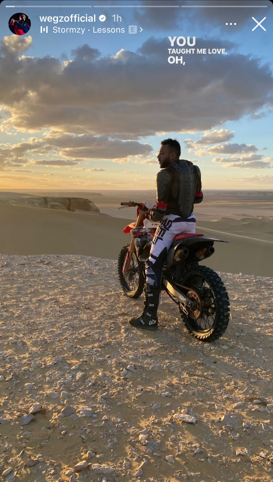 وظهر ويجز من الصحراء بملابس متسابقي الدرجات النارية، خلال خاصية ستوري بحسابه بانستجرام.