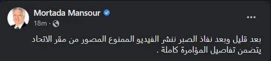 ونشر مرتضى، منشور عبر حسابه الرسمي بموقع التواصل الاجتماعي “ فيس بوك”، وكتب: بعد قليل وبعد نفاذ الصبر، ننشر الفيديو الممنوع، من مقر الاتحاد، يتضمن تفاصيل المؤامرة كاملة".