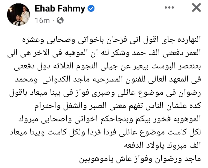 وكتب إيهاب فهمي عبر حسابه الرسمي بموقع التواصل الإجتماعي “فيسبوك”: النهاردة جاي أقول انى فرحان باخواتى وصحابي وعشرة العمر دفعتي الف حمد وشكر لله ان الموهبة في الأخر هى الى بتنتصر.