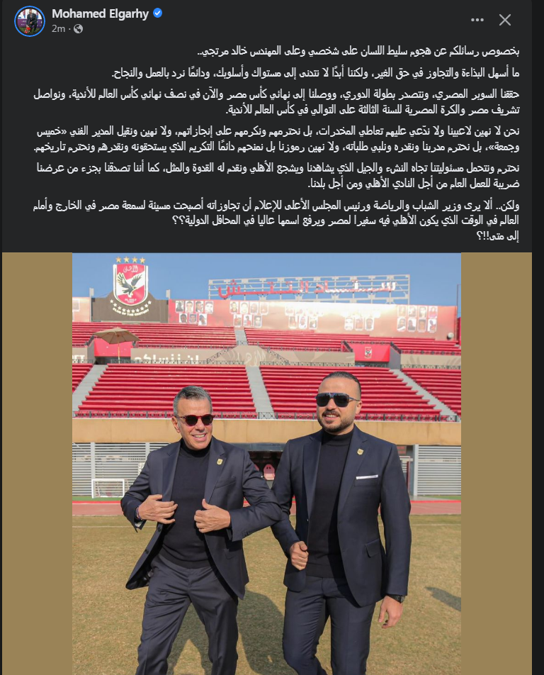 وأختتم قائلاً:" ولكن ألا يرى وزير الشباب والرياضة ورئيس المجلس الأعلى للإعلام أن تجاوزاته أصبحت مسيئة لسمعة مصر في الخارج وأمام العالم في الوقت الذي يكون الأهلي فيه سفيرا لمصر ويرفع اسمها عاليا في المحافل الدولية، إلى متى.