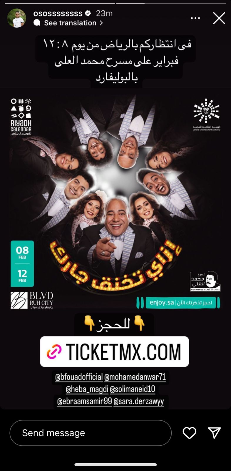 ونشر أوس أوس البوستر الرسمي للمسرحية عبر خاصية ستوري بانستجرام، معلقًا: في انتظاركم بالرياض في يوم ١٢:٨ فبراير على مسرح محمد العلي بالبوليفارد.