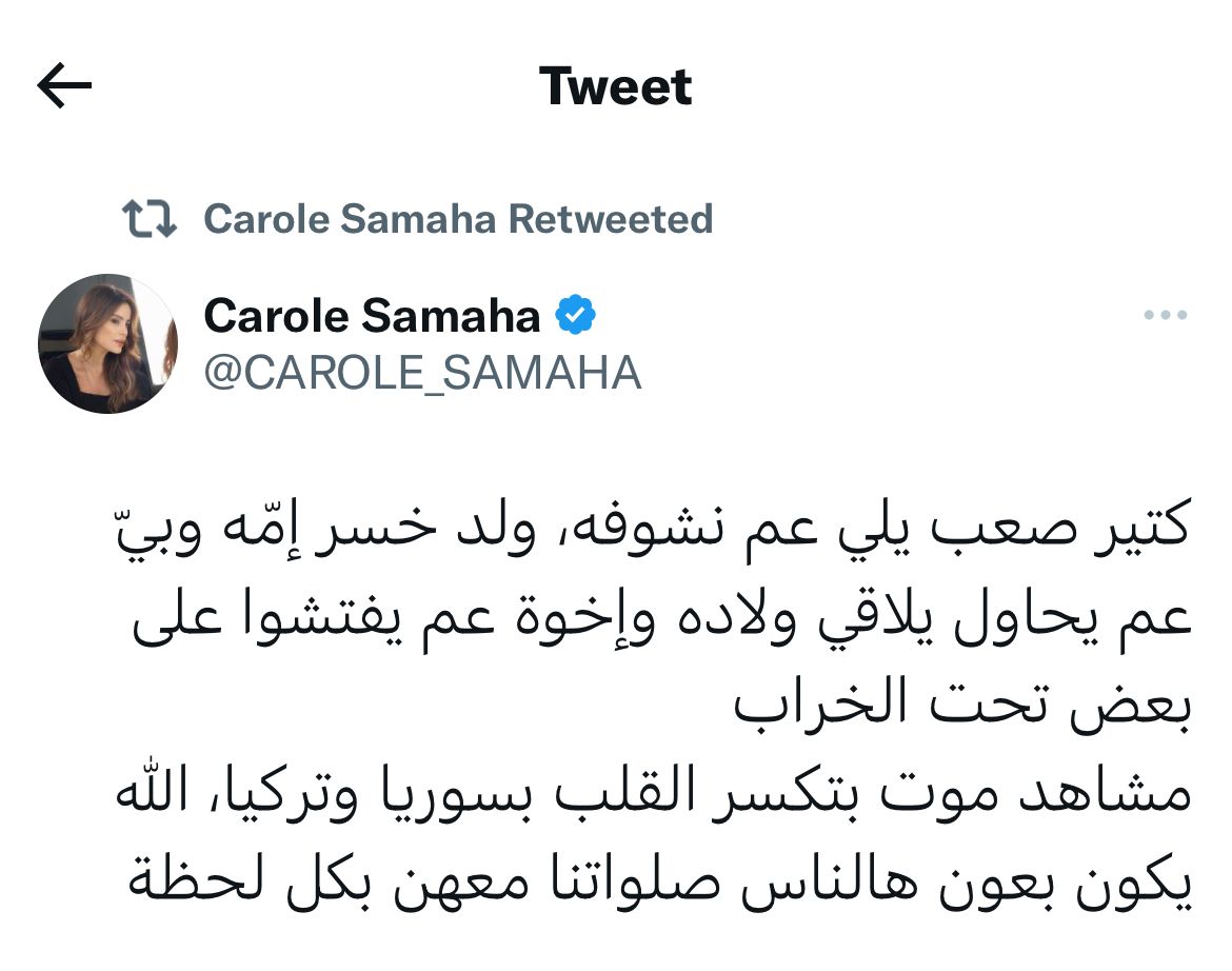 حرصت الفنانة كارول سماحة على توجيه خالص الدعاء لضحايا الزلزال في سوريا وتركيا، وذلك عبر حسابها الرسمي بموقع تويتر.