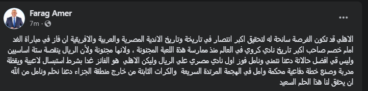 وكتب فرج عامر عبر"فيسبوك":" الأهلي قد تكون الفرصة سانحة له لتحقيق اكبر انتصار في تاريخة، وتاريخ الأندية المصرية والعربية، والافريقية أن فاز في مباراة الغد أمام خصم صاحب اكبر تاريخ نادي كروي في العالم منذ ممارسة هذة اللعبة المجنونة".