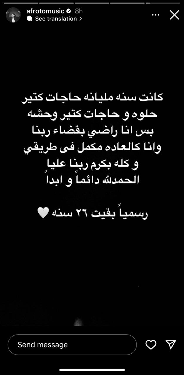 وتابع: وأنا كالعادة مكمل في طريقي وكله بكرم ربنا عليا الحمد لله دائمًا وابدًا.. رسميًا بقيت 26 سنة.