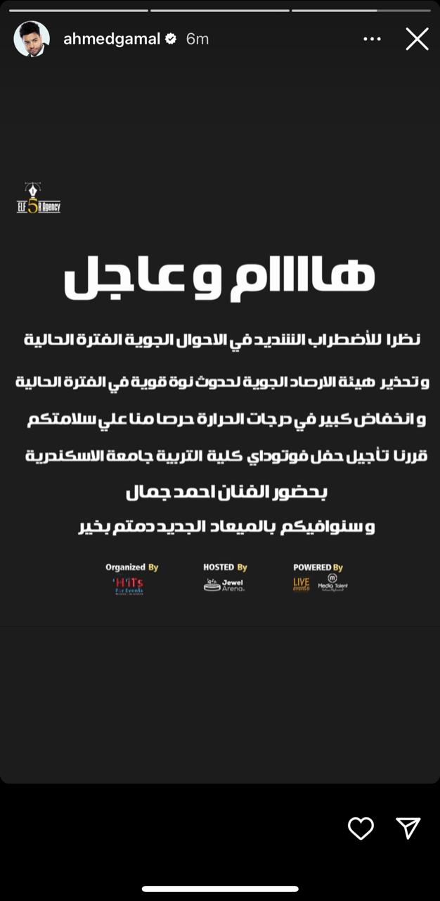 أعلن الفنان أحمد جمال عن تأجيل حفله لخريجي كلية التربية الذي كان من المقرر أن ينعقد اليوم، وذلك نظرًا لسوء الأحوال الجوية.