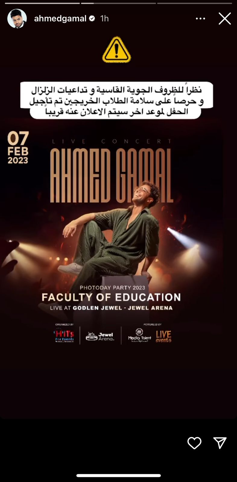 ونشر أحمد جمال بوستر الحفل، معلقًا: نظرًا للظروف الجوية القاسية وتداعيات الزلزال وحرصًا على سلامة الطلاب الخريجين تم تأجيل الحفل لموعد اخر سيتم الاعلان عنه قريبًا.