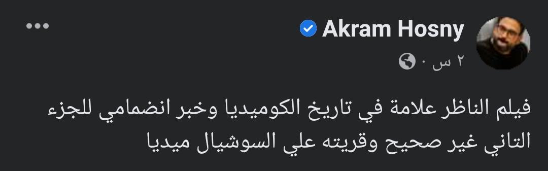 نفى الفنان أكرم حسني كل ما تم تداوله في الساعات الماضية الأخيرة بشأن تقديمه لجزء ثان من فيلم "الناظر"، وذلك من خلال منشور عبر حسابه الشخصي على موقع التواصل الاجتماعي "فيسبوك".