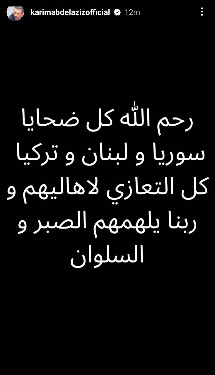 حرص الفنان كريم عبد العزيز على نعي ضحايا الزلزال الذي وقع أمس في سوريا وتركيا ولبنان، وذلك من خلال منشور عبر حسابه الشخصي على موقع تبادل الصور والفيديوهات إنستجرام من خلال خاصية إستوري.