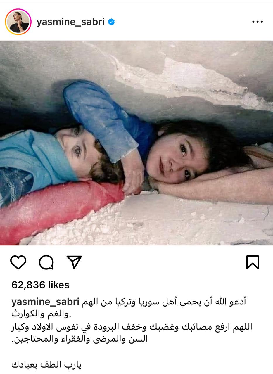 وجهت الفنانة ياسمين صبري خالص الدعاء للمتضررين من الزلزال في سوريا وتركيا، وذلك عبر حسابها الرسمي بموقع انستجرام.