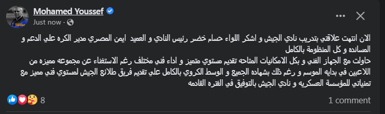 وكتب محمد يوسف عبر حسابه الرسمي"فيسبوك:" الأن انتهت علاقتي بتدريب نادي الجيش، واشكر اللواء حسام خضر رئيس النادي، والعميد أيمن المصري مدير الكره علي الدعم، والمساندة و كل المنظومة بالكامل".