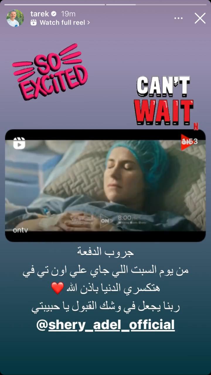 روج الفنان طارق صبري لمسلسل زوجته شيري عادل الجديد حكاية جروب الدفعة، ووجه لها رسالة دعم عبر حسابه الرسمي بموقع انستجرام.