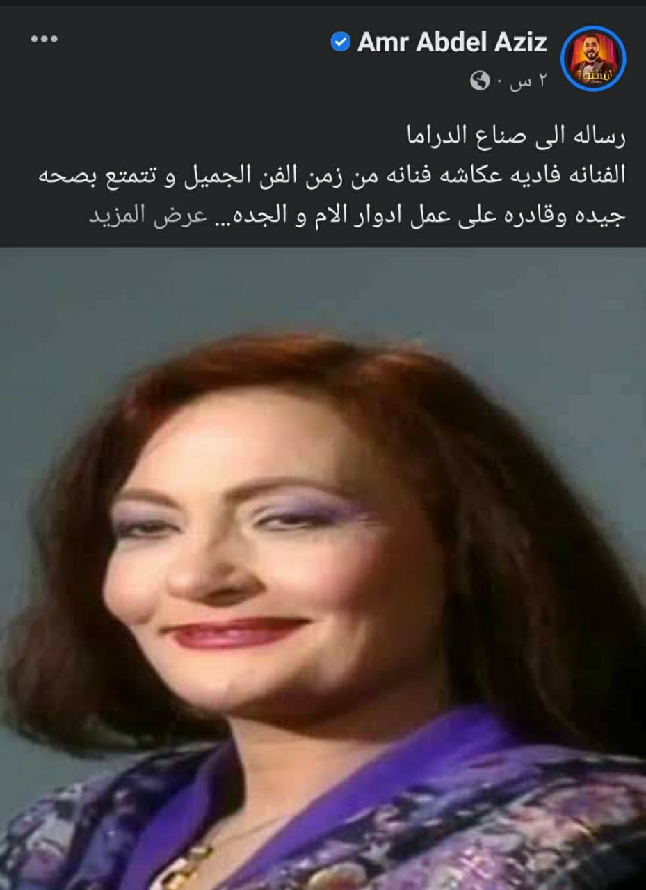 حيث نشر عبد العزيز صورة للفنانة فادية عكاشة، وعلق عليها قائلًا: "رسالة إلى صناع الدراما.. الفنانة فادية عكاشة فنانة من زمن الفن الجميل وتتمتع بصحة جيدة وقادرة على عمل أدوار الأم والجدة.. أرجو الاهتمام بها".