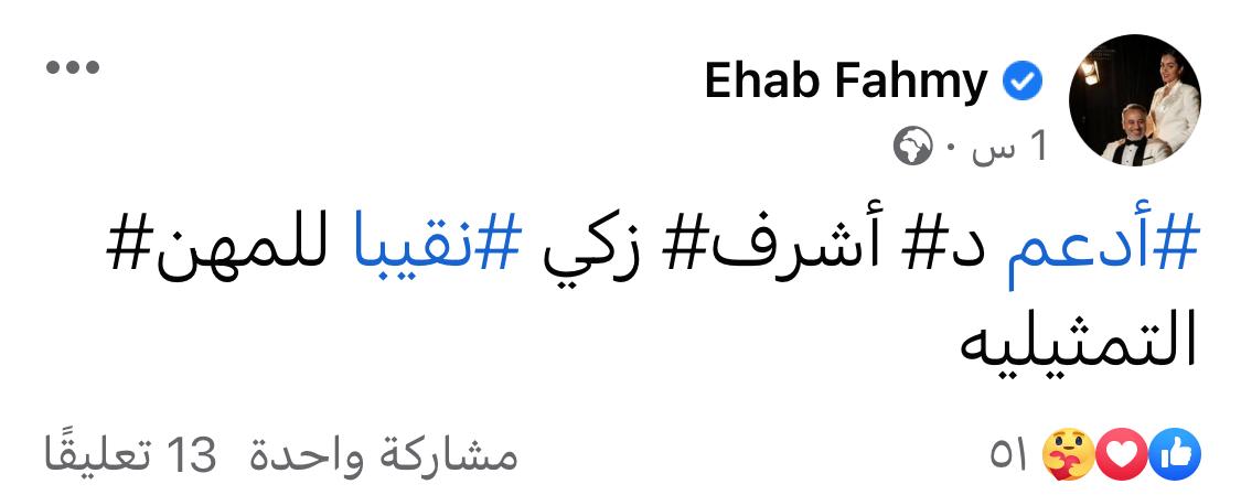 وكتب إيهاب فهمي عبر حسابه الشخصي على موقع التواصل الاجتماعي فيسبوك: ادعم أشرف زكي نقيبًا للمهن التمثيلية.