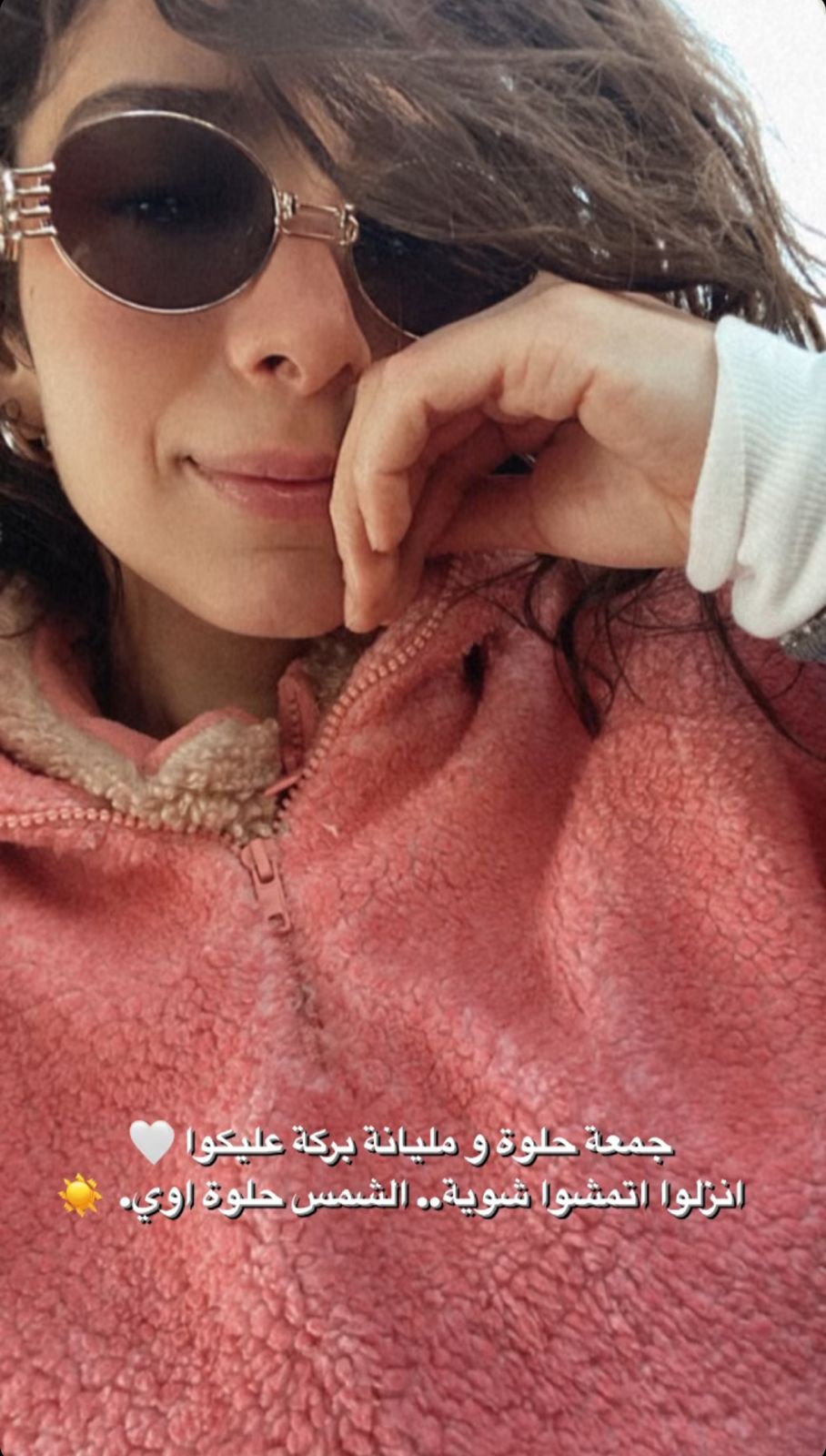 ونشرت داليا صورة لها بنظارة شمسية عبر خاصية ستوري بانستجرام، معلقة: جمعة حلوة ومليانة بركة عليكوا.. انزلوا اتمشوا شوية الشمس حلوة اوي.