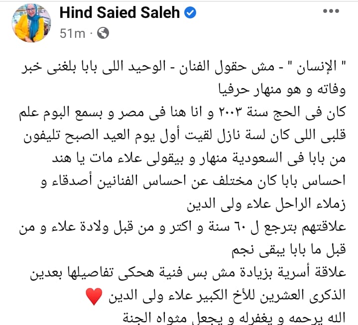 وكتبت هند سعيد صالح عبر حسابها الرسمي بموقع التواصل الإجتماعي “فيسبوك”: الإنسان مش هقول الفنان الوحيد اللى بابا بلغنى خبر وفاته و هو منهار حرفيا، كان فى الحج سنة ٢٠٠٣ و انا هنا فى مصر و بسمع البوم علم قلبى اللى كان لسة نازل لقيت أول يوم العيد الصبح تليفون من بابا فى السعودية منهار وبيقولى علاء مات يا هند