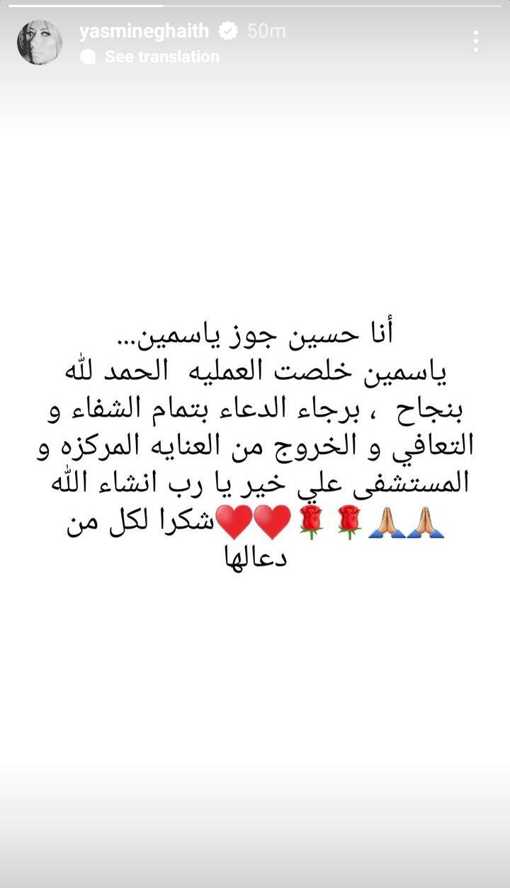 وكتبت ياسمين غيث عبر حسابها الرسمي بموقع تبادل الصور والفيديوهات انستجرام من خلال خاصية “ستوري”: أنا حسين جوز ياسمين.. ياسمين خلصت العملية بنجاح، برجاء الدعاء بتمام الشفاء والتعافي، والخروج من العناية المركزة في المستشفى، يا رب إن شاء الله، وشكرًا لكل من دعا لها.