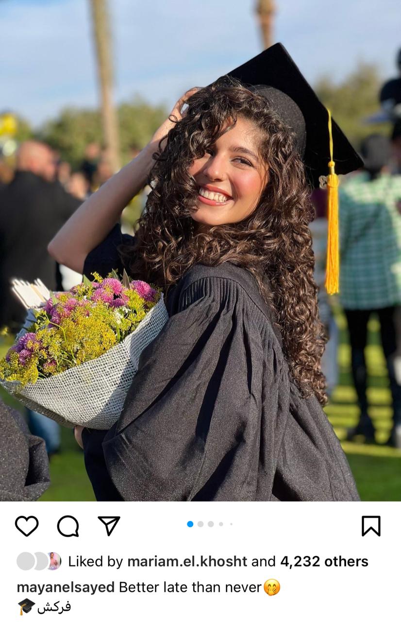 شاركت الفنانة الشابة مايان السيد متابعيها بصور لها بملابس التخرج، وذلك عبر حسابها الرسمي بموقع تبادل الصور والفيديوهات الشهير انستجرام.