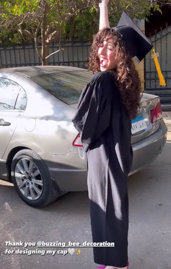 وظهرت مايان السيدة في صورها عبر حسابها الرسمي بموقع تبادل الصور والفيديوهات انستجرام عبر خاصية “ستوري”، بفستان بينك قصير وتركت شعرها المموج منسابا على ظهرها وارتدت روب التخرج وكاب عليه جملة: “مبروك يا أستاذة”.