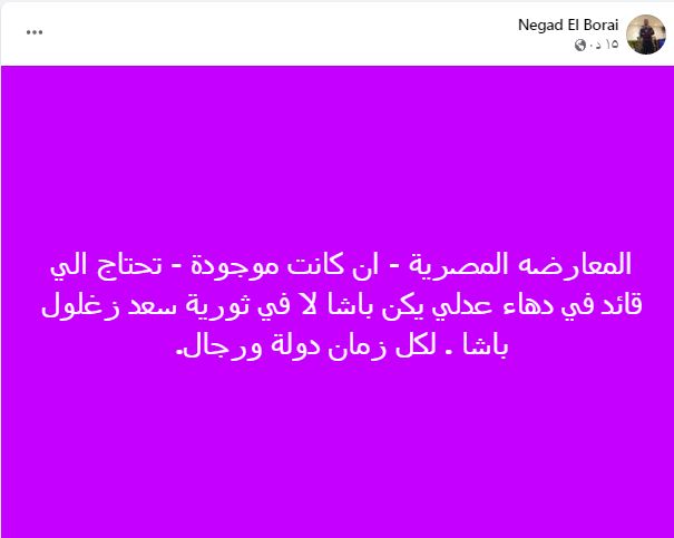 وكتب “البرعي”، عبر صفحته الشخصية على فيس بوك: «المعارضة المصرية - إن كانت موجودة - تحتاج إلي قائد في دهاء عدلي يكن باشا لا في ثورية سعد زغلول باشا.. لكل زمان دولة ورجال.»، مضيفًا: “ لكل زمان دولة ورجال”.
