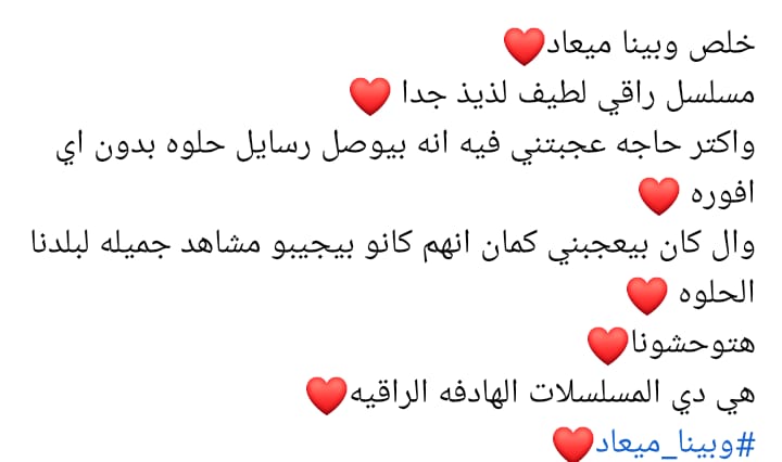 وكتب الأخر: خلص وبينا ميعاد، مسلسل راقي لطيف لذيذ جدا، واكتر حاجه عجبتني فيه انه بيوصل رسايل حلوه بدون اي افوره، وال كان بيعجبني كمان انهم كانو بيجيبو مشاهد جميله لبلدنا الحلوه ، هتوحشونا.. هي دي المسلسلات الهادفة الراقية.