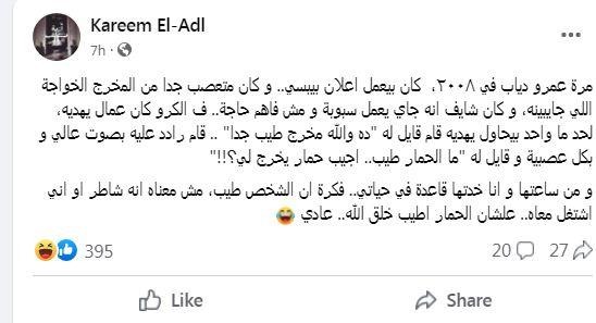 شارك المخرج كريم العدل منشورًا عبر حسابه الرسمي بموقع التواصل الاجتماعي "فيس بوك"، واسترجع من خلاله موقف طريف جمعه باالهضبة عمرو دياب أثناء تصوير أحد الإعلانات التليفيزيونية.