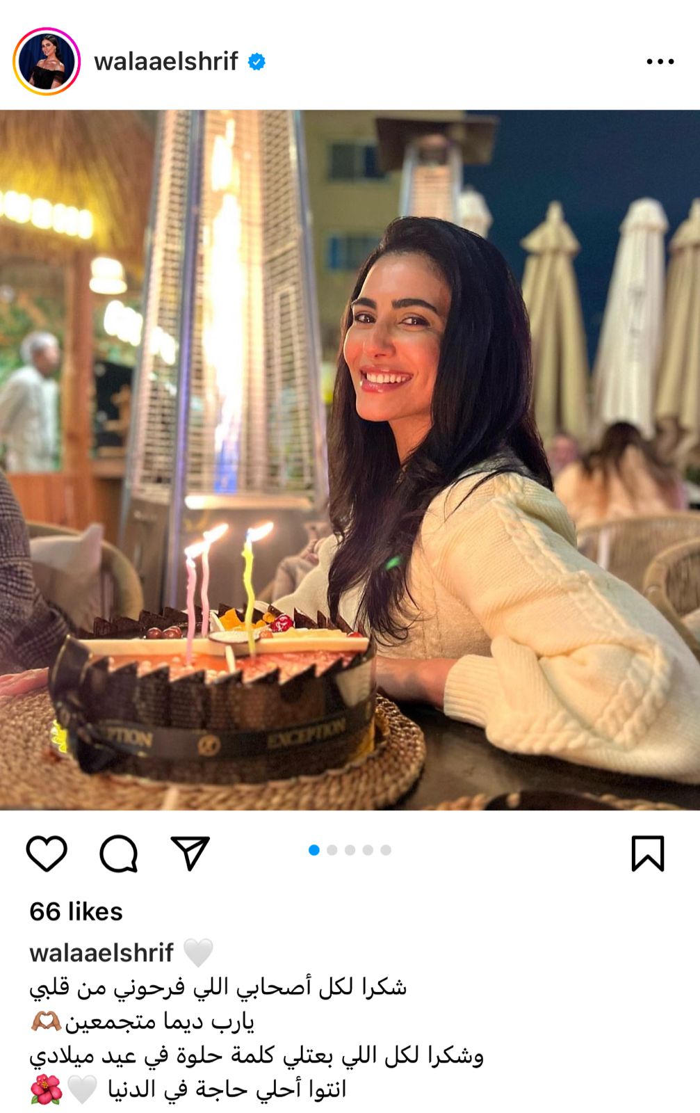 وجهت الفنانة ولاء الشريف رسائل شكر لجمهورها وأصدقائها بعد الاحتفال بعيد ميلادها، وذلك عبر حسابها الرسمي بموقع تبادل الصور والفيديوهات الشهير انستجرام.
