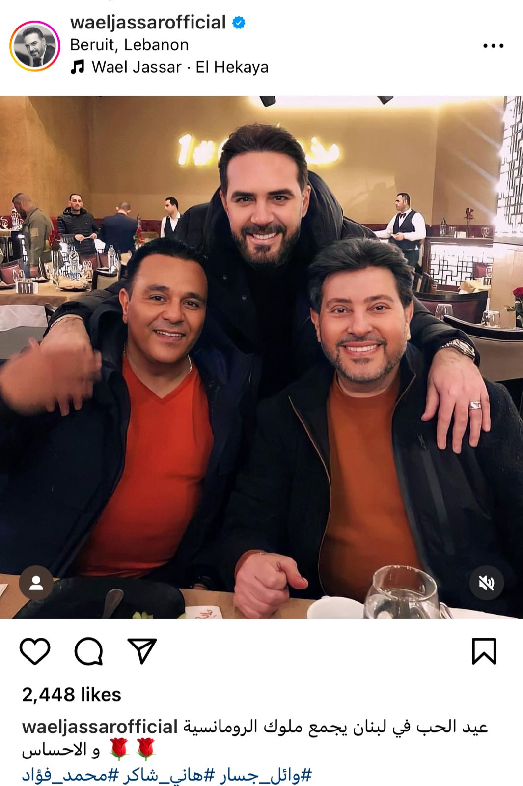 شارك الفنان وائل جسار صورة تجمعه بكلًا من هاني شاكر ومحمد فؤاد أثناء تواجدهم في لبنان لإحياء حفلات عيد الحب، وذلك عبر حسابه بانستجرام.