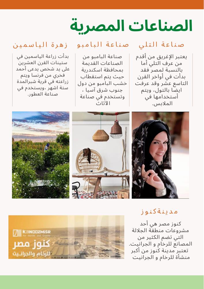 تتمثل أبرز هذه الصناعات في صناعة التلي التراثية داخل سوهاج التي يصدر عنها منتجات مصرية مميزة مثل السجاد والمفروشات، الصناعات التي تصدر عن قرية الياسمين "شبرا بلولة" وهي العطور العالمية، صناعات البامبو الشهيرة بالأسكندرية، وكذلك صناعة الرخام التي تعتمد عليها الدولة بشكل كبير في عدة محافظات.
