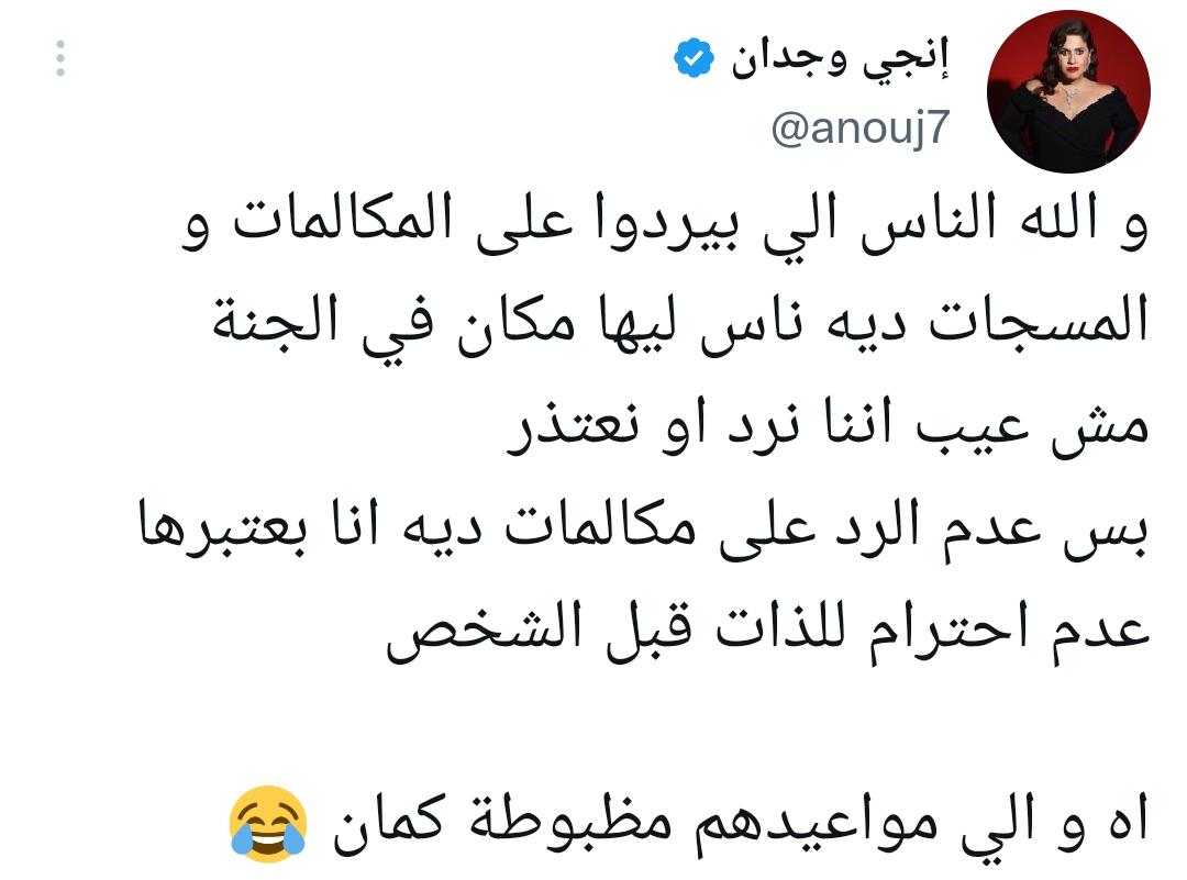 حيث كتبت: "والله الناس اللي بيردوا على المكالمات والمسجات ديه ناس ليها مكان في الجنة، مش عيب أننا نرد أو نعتذر، بس عدم الرد على مكالمات ديه أنا بعتبرها عدم احترام للذات قبل الشخص، اه واللي مواعيدهم مظبوطة كمان".