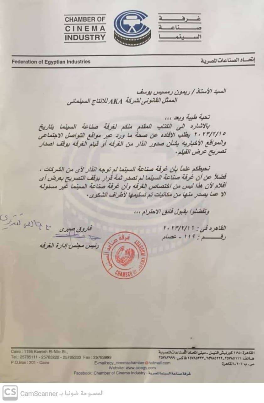 وقال البيان: بالإشارة إلى الكتاب المقدم منكم لغرفة صناعة السينما بتاريخ 15/2/2023 بطلب الإفادة عن صحة ما ورد عبر مواقع التواصل الإجتماعى والمواقع الإخبارية بشأن صدور انذار من الغرفة أو قيام الغرفة بوقف تصريح عرض الفيلم.