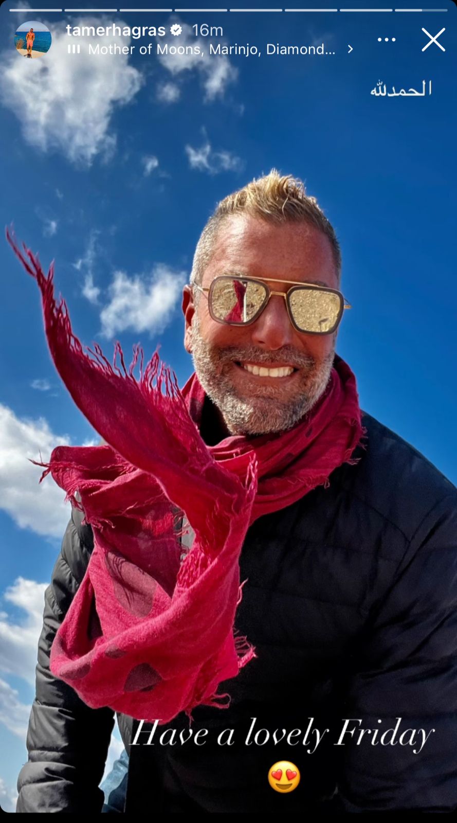 وظهر تامر هجرس بسكارف أحمر مع چاكيت أسود شتوي ثقيل، ونظارة شمسية، معلقًا: يوم جمعة لطيف.