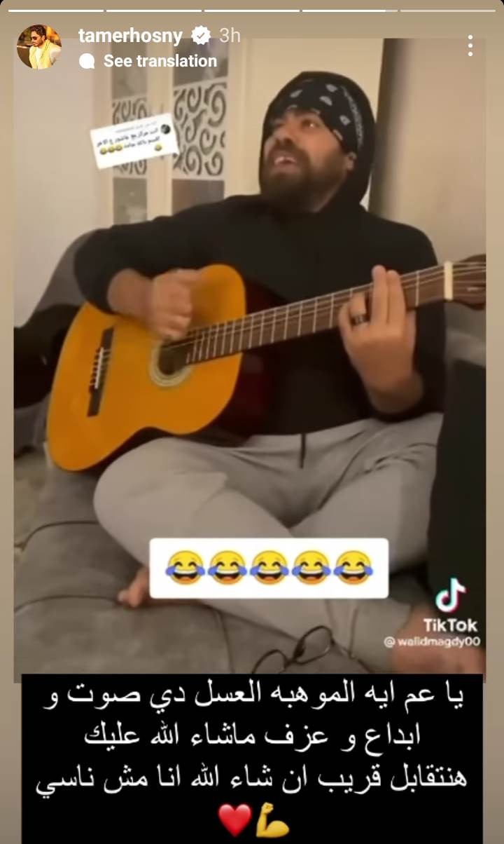 كتبت تامر حسني عبر حسابه الرسمي بموقع تبادل الصور والفيديوهات انستجرام عبر خاصية “ستوري”، معلقا على موهبة أحد الشباب، قائلا: "يا عم إيه الموهبة العسل دي .. صوت وابداع وعزف ما شاء الله عليك .. هنتقابل قريب إن شاء الله أنا مش ناسي”.