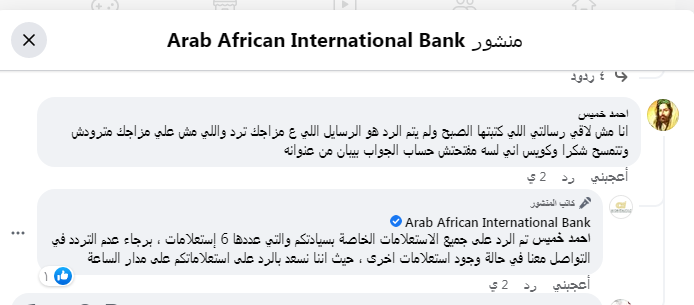 وقال أحد عملاء البنك العربى الافريقى في تعليق عبر صفحة المصرف الرسمية،: "أنا مش لاقي رسالتي اللي كتبتها الصبح ولم يتم الرد هو الرسايل اللي على مزاجك ترد واللي مش علي مزاجك مترودش وتتمسح شكرا وكويس إني لسه مفتحتش حساب الجواب بيبان من عنوانه".