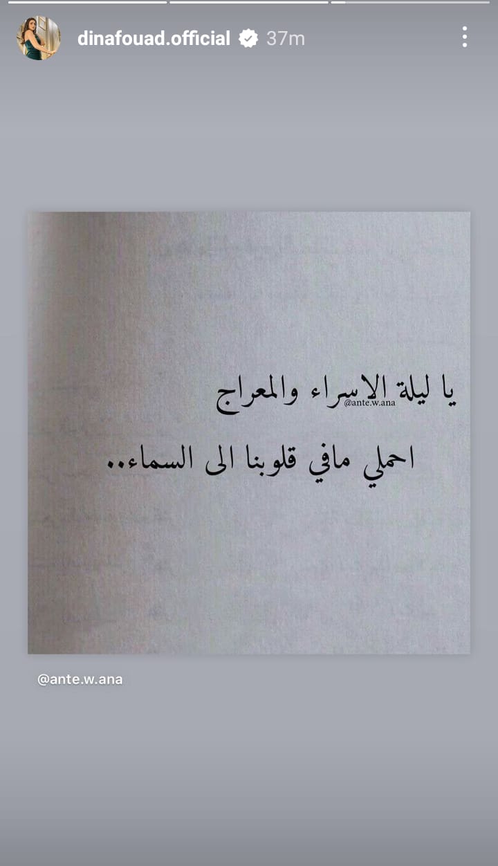كتبت دينا فؤاد عبر حسابها الرسمي بموقع تبادل الصور والفيديوهات انستجرام، عبر خاصية “ستوري”: يا ليلة الاسراء والمعراج احملي ما في قلوبنا إلى السماء.