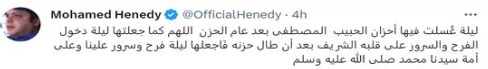 بينما كتب الفنان محمد هنيدي عبر حسابه الرسمي بموقع التدوينات القصيرة “تويتر”: ليلة غُسلت فيها أحزان الحبيب المصطفى بعد عام الحزن اللهم كما جعلتها ليلة دخول الفرح والسرور على قلبه الشريف بعد أن طال حزنه فَاجعلها ليلة فرح وسرور علينا وعلى أمة سيدنا محمد صلى الله عليه وسلم.
