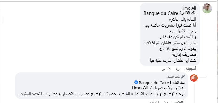 رد موظف بنك القاهرة في تعليق على الشكوى قائلاً: "يوجد العديد من البطاقات الائتمانية المقدمة من بنك القاهرة وتختلف الرسوم من كارت لأخر برجاء توضيح نوع البطاقة الخاصة".