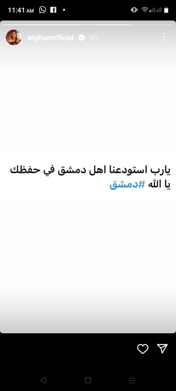 وكتبت أنغام عبر انستجرام: انغام عبر انستجرام: يا رب استودعنا أهل دمشق في حفظك يا الله.