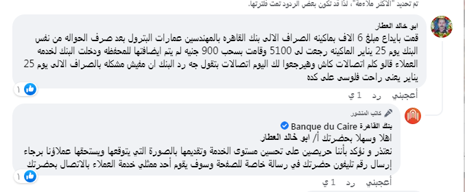 ورد موظف بنك القاهرة على شكوى العميل قائلاً: "نعتذر و نؤكد بأننا حريصين على تحسين مستوى الخدمة وتقديمها بالصورة التي يتوقعها ويستحقها عملاؤنا برجاء إرسال رقم تليفون حضرتك في رسالة خاصة للصفحة وسوف يقوم أحد ممثلي خدمة العملاء بالاتصال بك".
