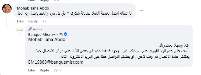 ورد موظف بنك مصر على الشكوى المقدمة قائلاً: "نأسف على عدم الرد الفوري على سيادتكم نظرا لوجود ضغط شديد في بعض الأيام على مركز الاتصال حيث يمكنكم إعادة الاتصال في وقت لاحق، أو يمكنكم التواصل معنا عبر البريد الالكترونى التالى