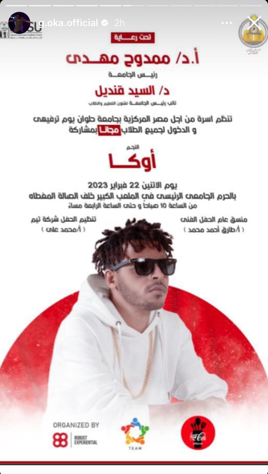يستعد مطرب المهرجانات الشعبية أوكا لإحياء حفلًا غنائيًا في جامعة حلوان، والتي روج لها عبر حسابه الرسمي بموقع انستجرام.
