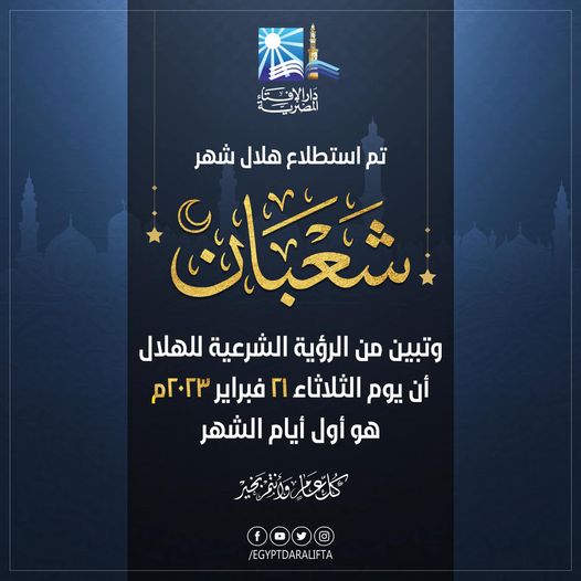 وعلى ذلك، أعلنت دارُ الإفتاءِ المصريةُ أن يومَ الثلاثاء الموافق الواحد والعشرين من شهر فبراير لعام ألفين وثلاثة وعشرين ميلاديًّا هو أول أيام شهر شعبان لعام ألفٍ وأربعمائةٍ وأربعة وأربعين هجريًّا.
